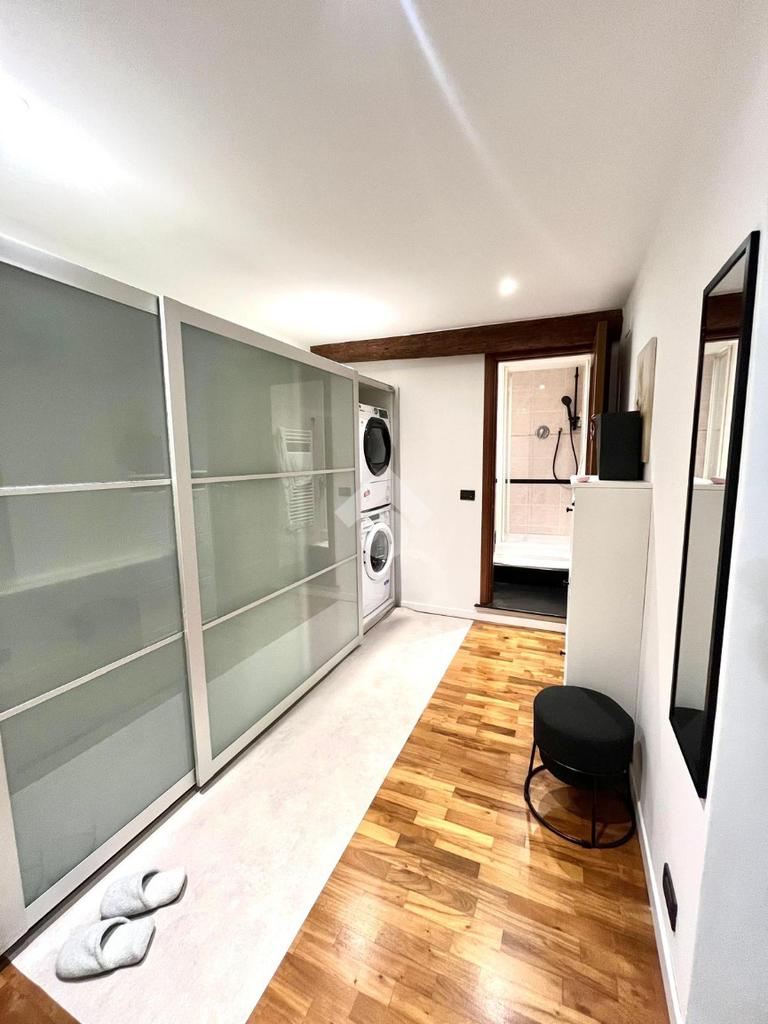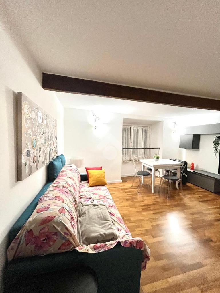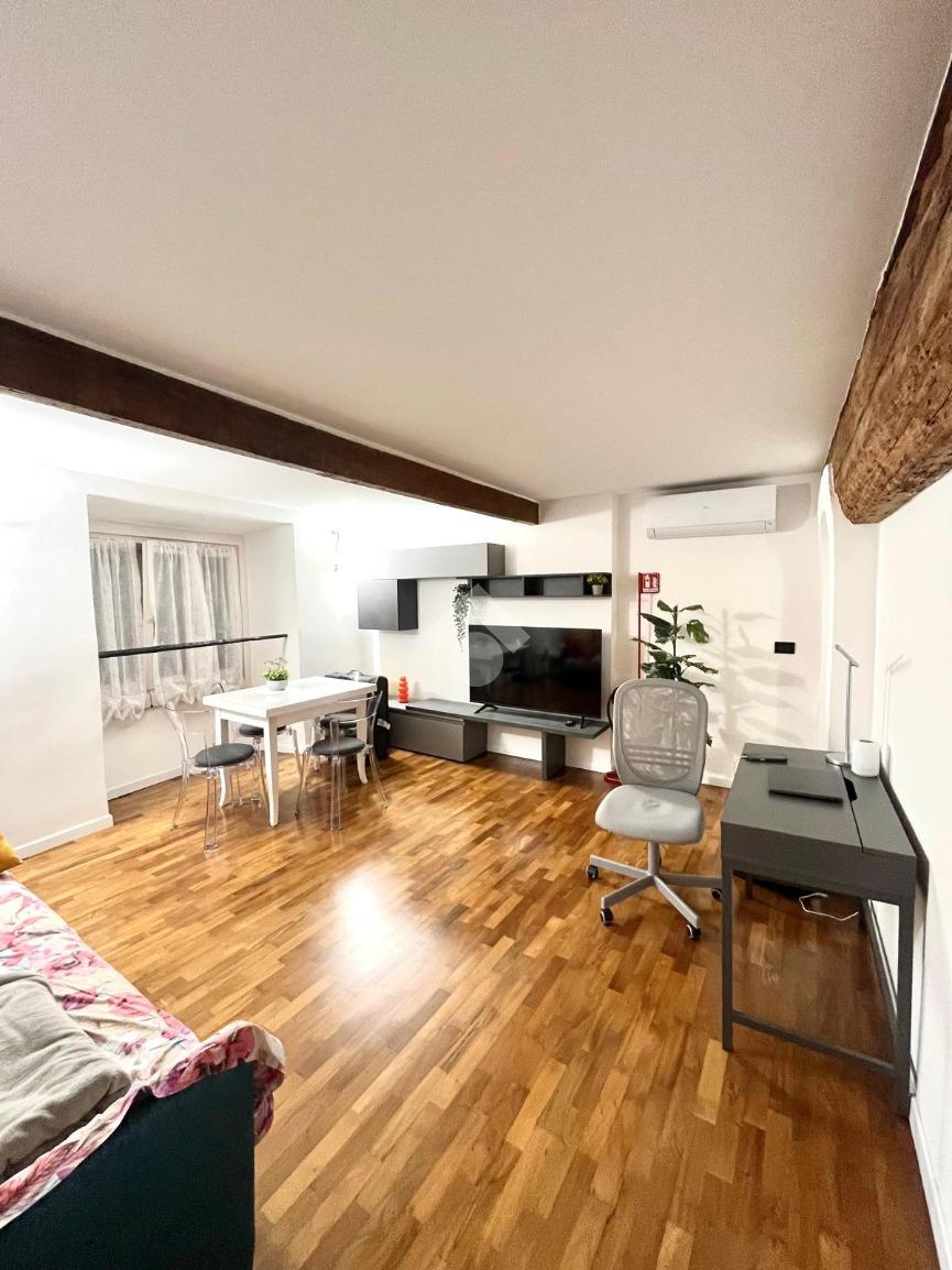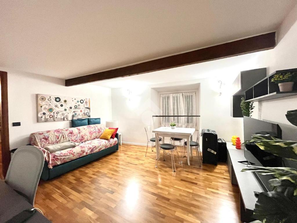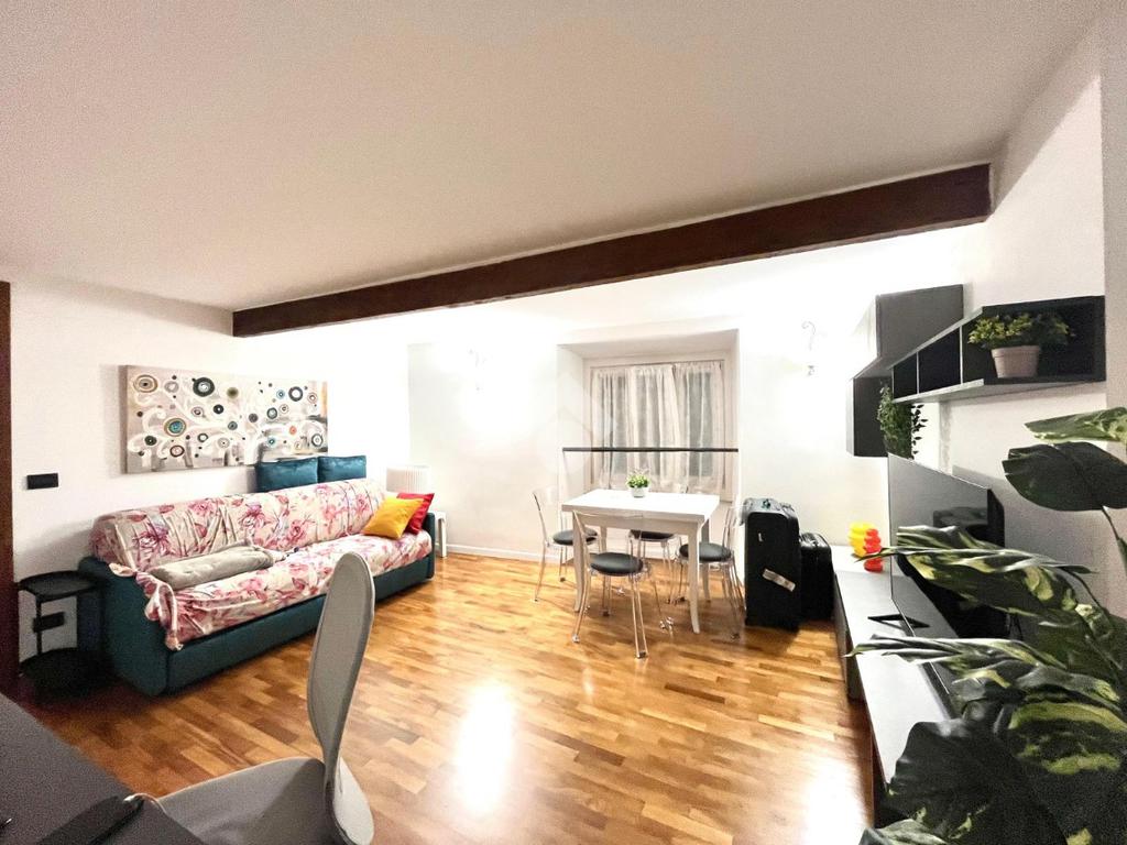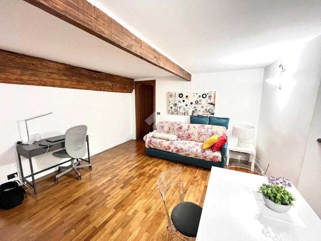 L'ingresso è direttamente nella Zona Giorno, composta da un ampio soggiorno con travi a vista e scorcio sulla Chiesa di San Giorgio.
