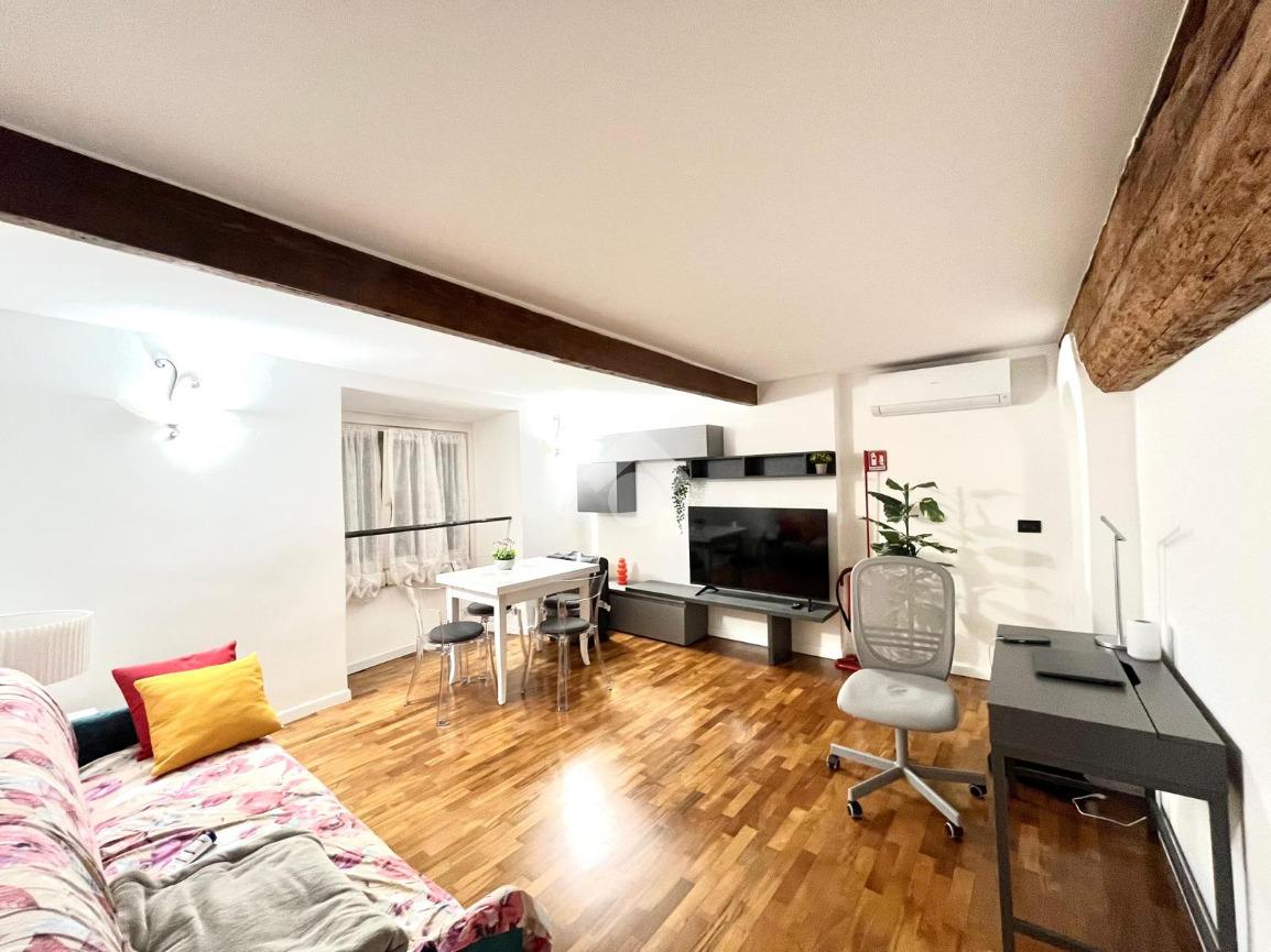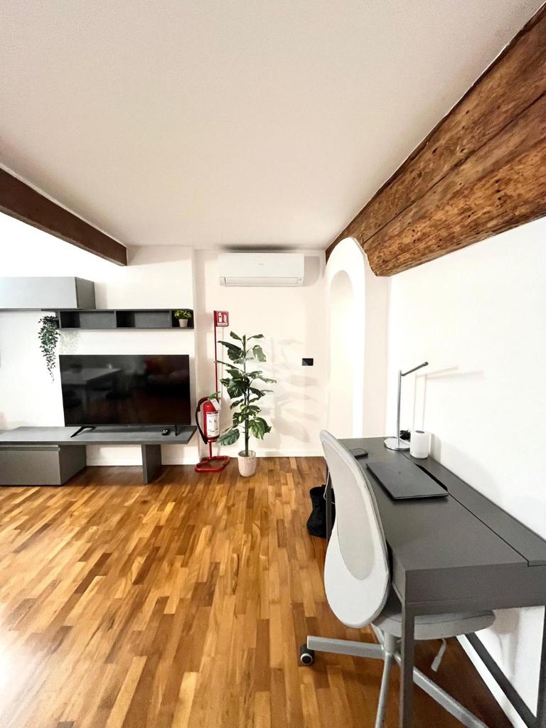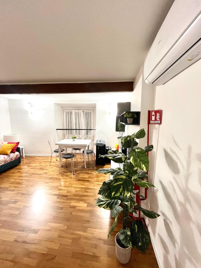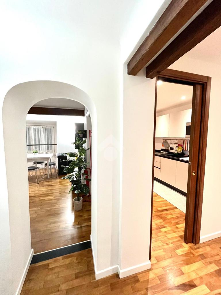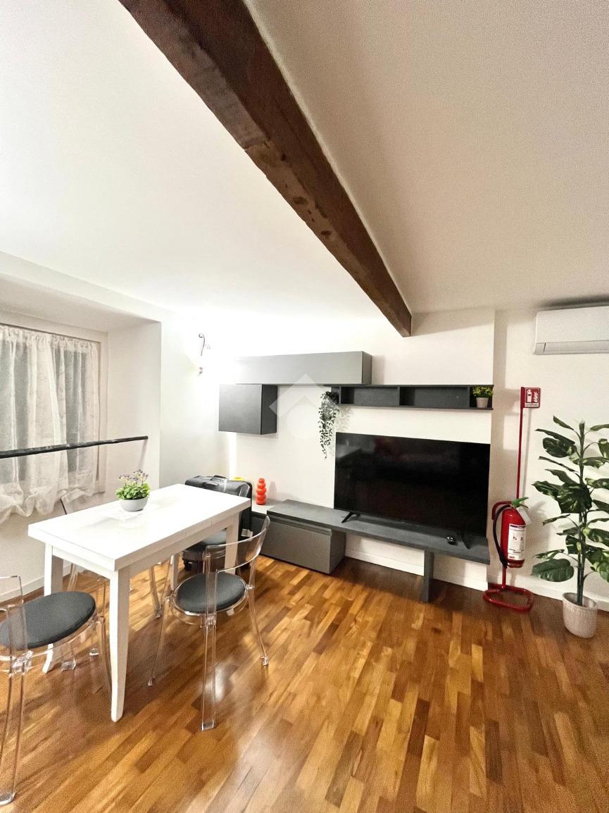 L'ingresso è direttamente nella Zona Giorno, composta da un ampio soggiorno con travi a vista e scorcio sulla Chiesa di San Giorgio.
