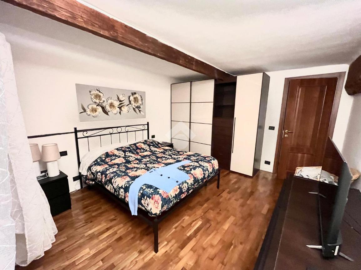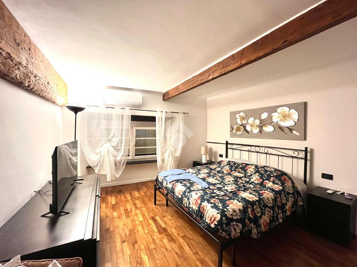 La zona Notte è composta da un ampia camera da letto matrimoniale, anch'essa con travi a vista e affaccio su piazza Grillo Cattaneo.
