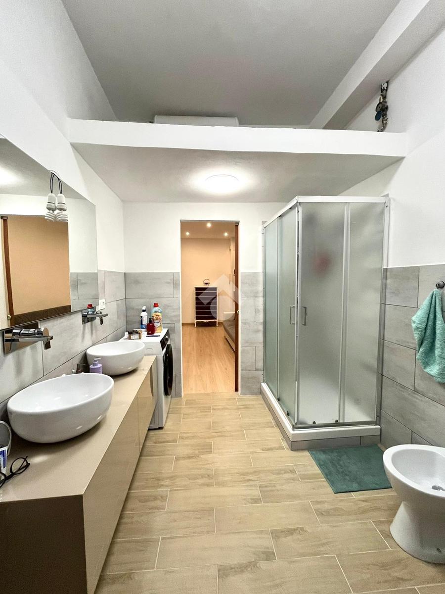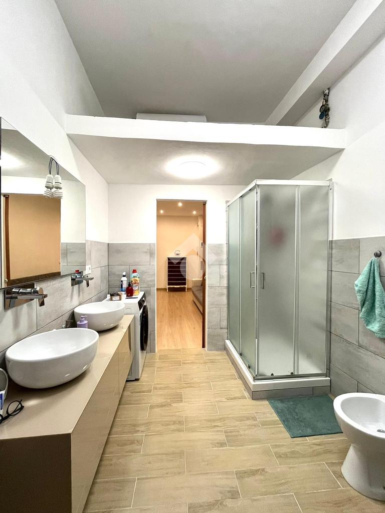 Il bagno è dotato di box doccia, finestrato, doppio lavabo e soppalco/ripostiglio.