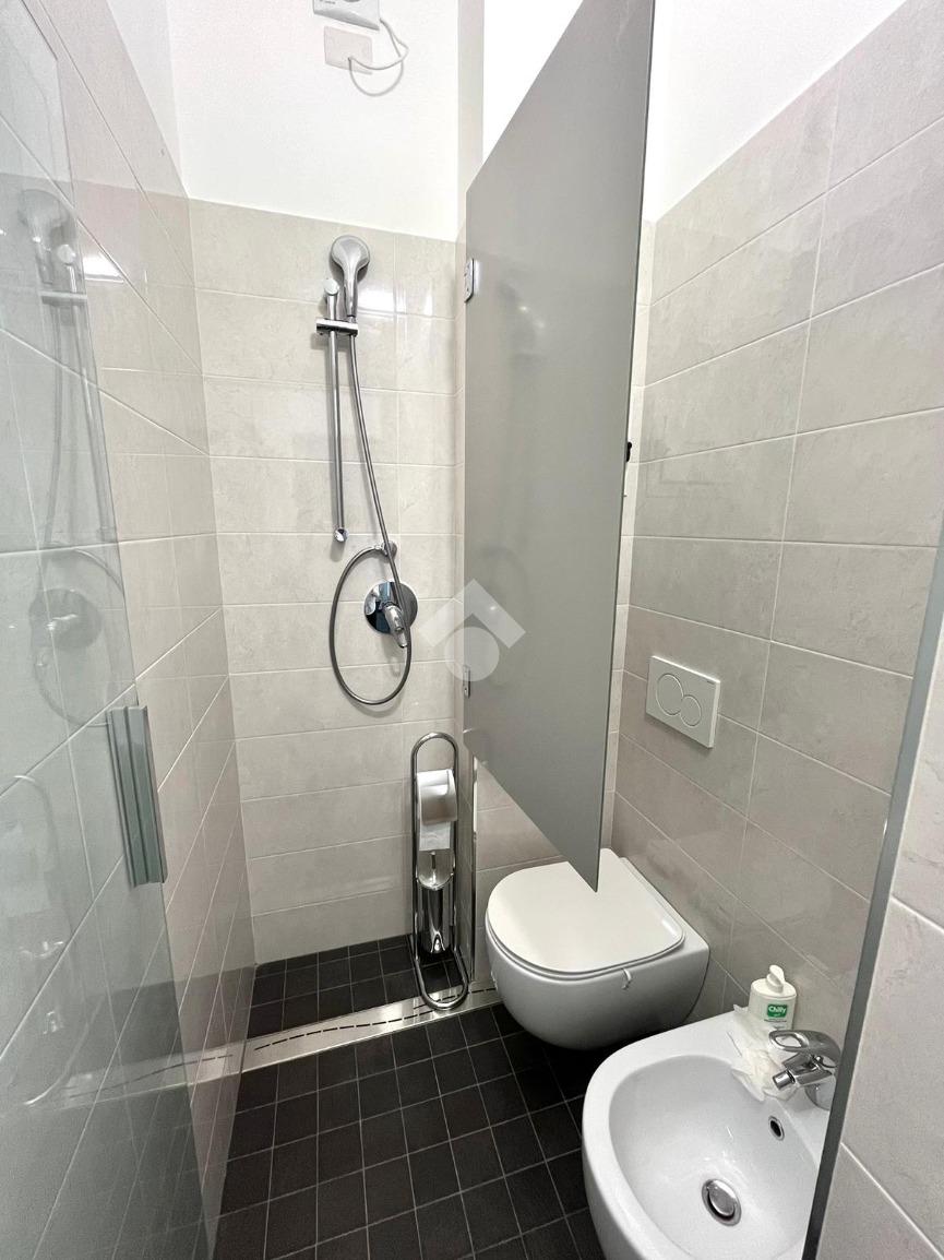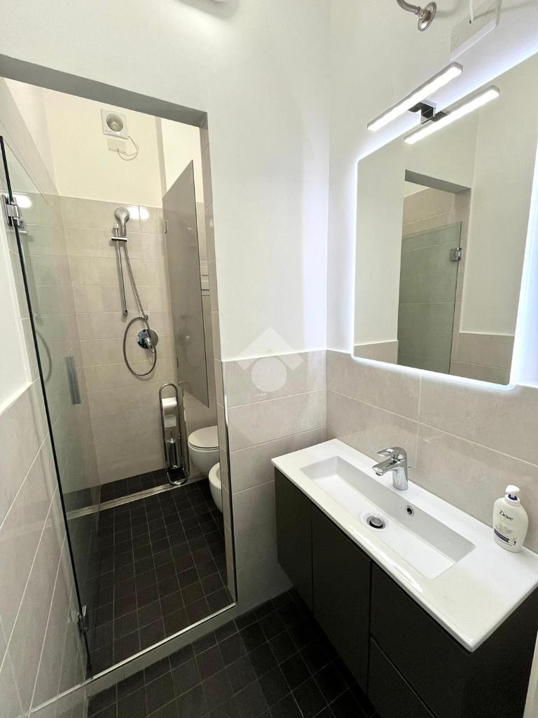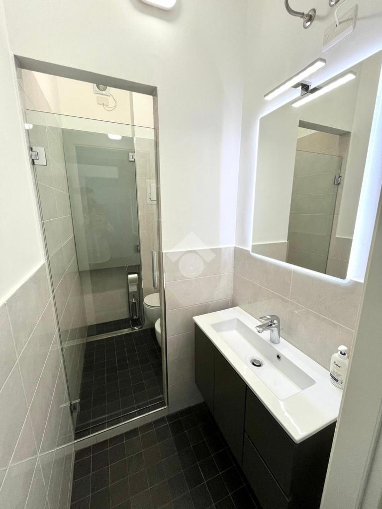 Il bagno, finemente ristrutturato, con box doccia. L'immobile è dotato di riscaldamento centralizzato e di aria condizionata.