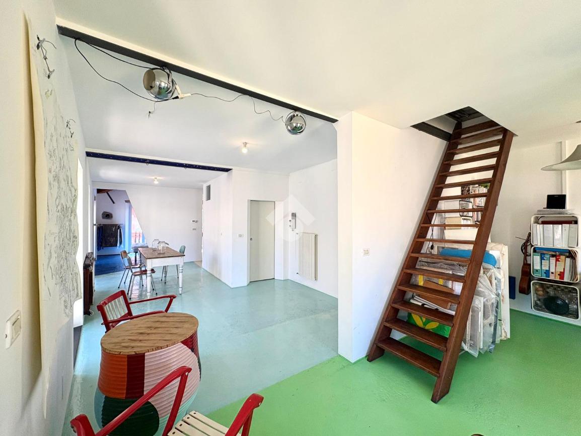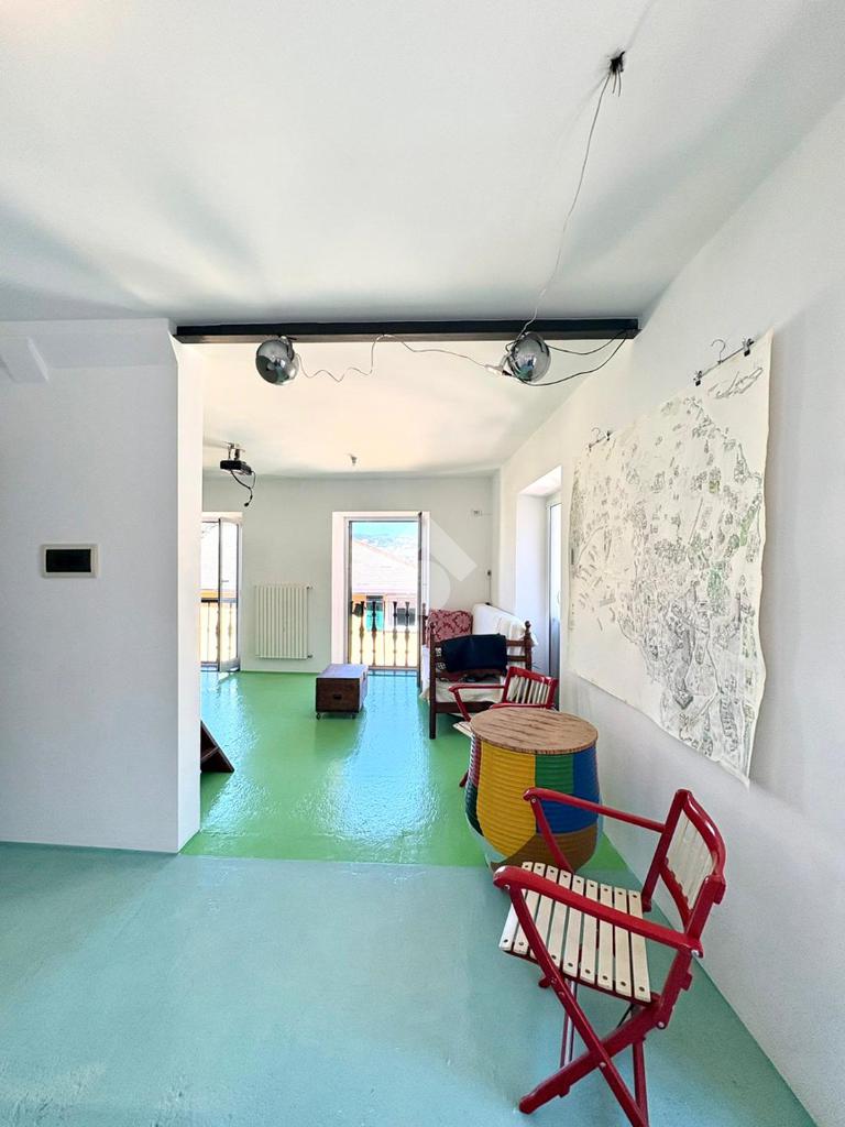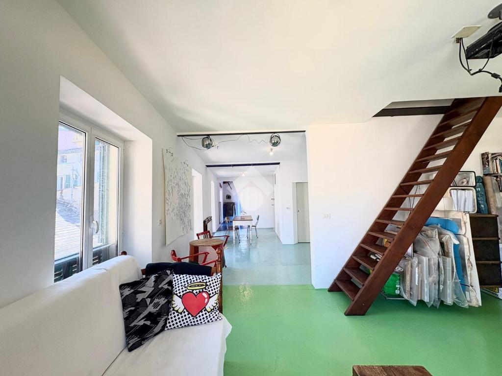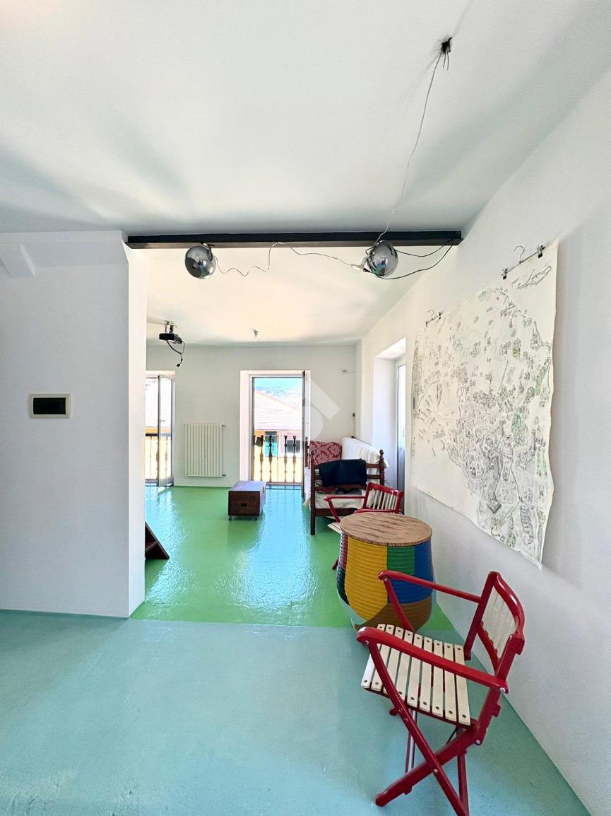 L'ingresso è direttamente in un ampia e luminosa zona living, attualmete composta da un unico grande open space di circa 60Mq, dove vi è la possibilità di ricreare una zona Sala/cucina ad angolo e creare una seconda camera da letto. La cucina attualmente è vivibile con travi a vista. Dalla zona giono possiamo accedere direttamente ad uno dei terrazzi più belli di tutta Genova, con una vista panoramica su tutta la città.
